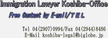 | ‘ Gyoseishoshi Lawyer: @@Certified Administrative Procedures Legal Specialist with an incidental @@ role as an agent for Administrative Appeal under Gyouseishohi Lawyer @@Act .iJapan Gyoseishoshi Association Registration No :12132064) ‘ Immigration Lawyer: @@@Registered and autholized by the Tokyo Regional Immigration Bureau ‘ Foreign Language-Friendly @@Certified Administrative Procedures Legal Specialist @@ Listed by International Financial Center Japan ‘ Legal Counsellor for Foreign Residents @@@@Legal counselling with English ‘ EIKEN Certification Grade 1 (English) @@ Pratical English Proficiency Grade 1 ‘ Certified National Guide Interpreter @@Certified English speaking Guide ‘ hs@Consultant @@Certified Application System Engineer ‘Office Location: @ 66-4,Matsugo,Tokorozawa-city,Saitama,Japan@§359-0027 @@ιΚ§ςsΌ½UU|Sin}j @@@sdkFOSiQXOVjOXXS @@@ e`wFOSiQXSSjWSWU @ @@CellFOXOiVVOOjTOPX @ @@dmailF@koshiba-legal@biglobe.jp @@ ‘Days FMonday through Friday (except national holidays) @@Hours FXFOO`PWFOO @@Face to Face Contact:Need Reservation (Free Contact by E-Mail/TEL), ‘Service Areas: : @@< Saitama> @@@@Saitama, Kawaguchi, Tokorozawa, Sayama, Fujimino, Kawagoe, @@ @ Iruma, Hanno, Asaka, Koshigaya, Kasukabe, Satte and others @@<Tokyo> @@@@Every 23 wards, Kiyose, Higashimurayama, Kokubunji, Fuchu, @@@@Tachikawa, Nishitokyo, Kodaira, Koganei and others @@@<Yamanashi> @@@@Kofu,Uenohara,Otsuki,Yamanashi,Tsuru,Fuefuki,Minamiarupusu, @@@@Others @@@<Others>@Kanagawa, Ibaragi, Chiba, Tochigi, Gunma @@@@@@@@@ Nagano, etc. |
